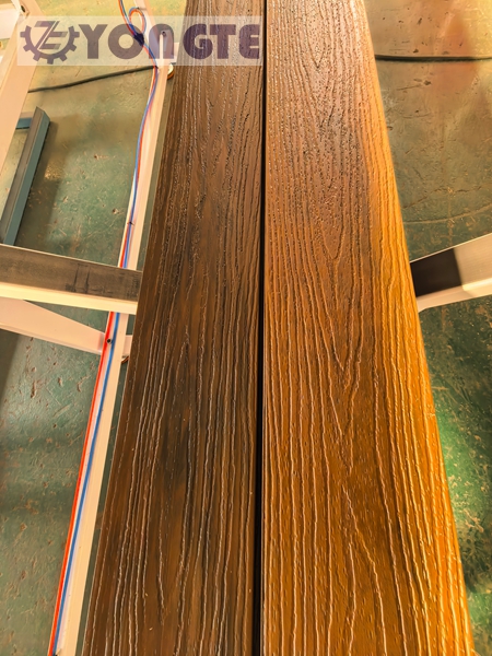 Volgens Yongte se tegniese span het hierdie opgradering hoofsaaklik gefokus op vormpresisie en prosesbeheerstelsels. Voorheen het die bedryf dikwels probleme ondervind met 3D-reliëfprosesse, soos ongelyke tekstuurdiepte en oppervlakverdraaiing. Deur herhaalde aanpassings en geleidelike optimalisering van vormontwerp en temperatuurbeheerparameters, het hulle uiteindelik tekstuurreproduksie van meer as 95% behaal, en die produkkwalifikasiekoers het van 92% tot 98,5% gespring. Hierdie produksielyn is nou in staat om houtvesel en omgewingsvriendelike HDPE-saamgestelde materiale betroubaar te verwerk, wat reliëfteksture tot 2–3 mm diep bereik. Of dit nou die ruwe tekstuur van eikebome of die delikate tekstuur van okkerneut is, die tekstuur en visuele effek is hoogs reproduceerbaar, wat die gevoel en visuele effek feitlik ononderskeibaar maak van die regte ding.