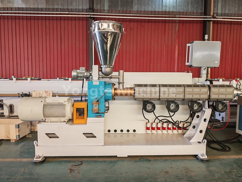 (1) Die ekstruder is spesiaal ontwerp vir die verwerking van herwinde rubberpoeier en PE-korrelmengsels.